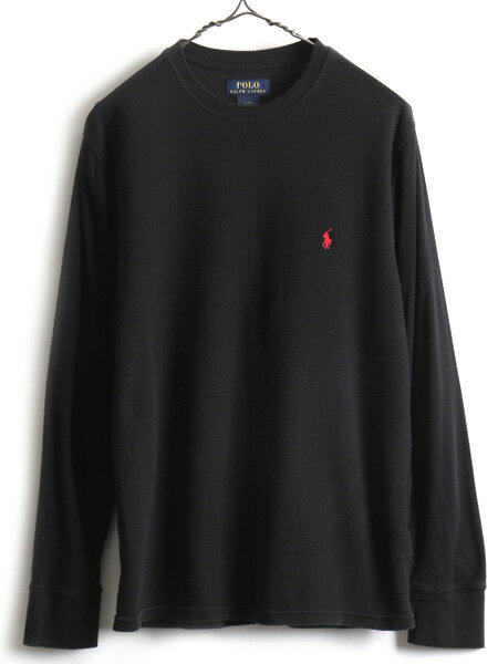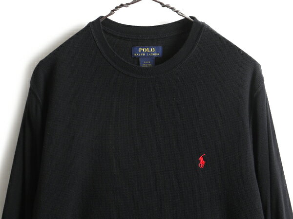【8/19 10%OFFクーポン&最大半額!】 人気 黒 ■ POLO ポロ ラルフローレン クルーネック サーマル 切替 長袖 Tシャツ ( メンズ L ) 古着 ロンT ワンポイント ワッフル ブラック| レディース 中古 ラルフ RALPH LAUREN 長袖Tシャツ サーマルTシャツ 無地Tシャツ 無地 ロゴT