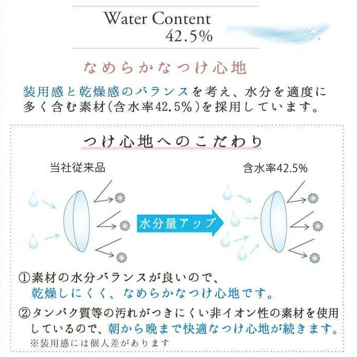 ネオサイトカラー史上初の「うるおい成分(MPCポリマー)」を配合し、 装用時の異物感・渇きを軽減いたします。