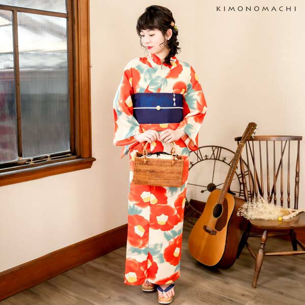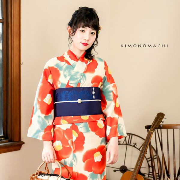 (SALE価格据え置き8/31迄)レディース 浴衣2点セット(浴衣+帯) 「浴衣 クリーム 水彩椿+半幅帯 ネイビーブルー レトロフラワー」 きもの町オリジナル 【メール便不可】ss2206ykl10