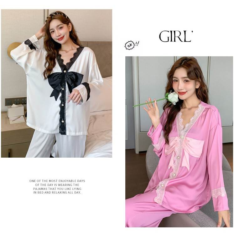 2色 パジャマ ルームウェア レディース 上下セット 長袖 無地 リボン フリル 可愛い バイカラー 春 夏 秋 部屋着 ナイトウエア 寝間着 ツーピース ボタン 白 ピンク ホワイト 光沢 サテン風 シルク風 おしゃれ かわいい ラブリー 大きいサイズ M L XL 2XL 可愛い 個性的 イ