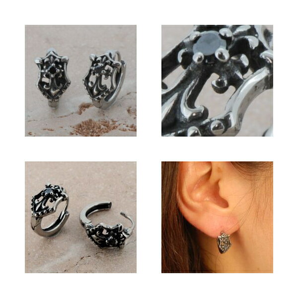クロス フープピアス 2P 両耳用 ブラックCZ フレア シールド 盾 ジルコニア ピアス イヤリング サージカルステンレス 金属アレルギーフリー メンズ レディース 男性 女性 アクセサリー ギフト プレゼント おしゃれ