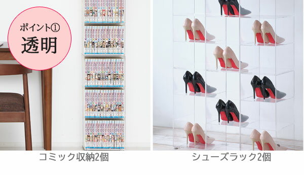 [アクリリック 透明収納棚] 極薄コミック収納2個組 シューズラック2個組 透明な収納で圧迫感を感じさせない アクリリック 極薄コミック収納棚 クロシオ アクリリック 極薄コミック収納2個組 インテリア性と実用性があるアクリルの透明収納棚。