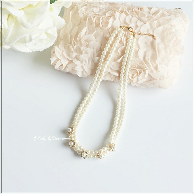 ITEM POINT 2連タイプのパールネックレス ラインストーンの輝きで首元をさらに華やかに魅せてくれます。