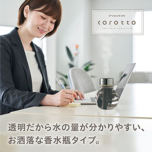 充電時間:約5時間(電池が空状態から充電を開始/25℃)、使用時間・通常運転:約8時間、充電池運転:約4時間(満充電状態から使用/25℃)商品電力:約2.5W(受電時)、加湿性能:1時間あたり約50ml水タンク容量:約400ml、USBケーブル長さ:約1.0m香水瓶のような丸いボトル。