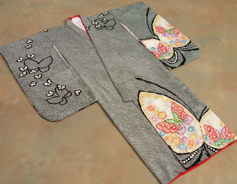 商品情報 商品番号 k77-92 商品内容 正絹着物 長襦袢 重ね衿(赤色) 色目 着物 黒色柄 舞蝶文様 素材 着物 【表地】絹100%【裏地】ポリエステル100%襦袢 ポリエステル100% 寸法 対象年齢 おもに7歳~9歳くらいに対応します対応身長 約110cm~140cm【着物】身丈約138cm 、袖丈約76cm 、裄丈約58cm【長襦袢】身丈約120cm※御着物は9歳くらいのお子様でも着用可能な通常より少し大きめの作りになっています※着用には必ず肩上げが必要になります ご注意 ※袋の中にたたんで収納されているため軽いタタミしわがついている場合がございますのでご了承下さい※生地の裁断位置により多少柄の出方が変わることがございます※染め物ですので細かい染料とび(気にならない程度の物)はご了承下さい 黒色総本手絞り手染めの七五三の7歳の御祝着に最適な正絹御着物と長襦袢のセットです!! 総鹿の子本絞りの生地は非常にボリュームがあり生地感は抜群です!! 赤色の重ね衿が初めから付いていて取り付け不要です!! 絞りで舞い踊る蝶を表現した上品な古典柄になります!! 御着物に合わせた長襦袢もセットで付いており、長襦袢は袖部分が袷(あわせ)になった袖無双仕立てになります!! 御着物を収納する専用ビニール袋付き!! 【7歳用のフルセットも御座いますのでそちらもご覧下さい!】