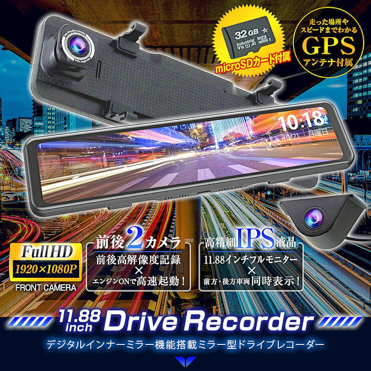 【商品内容】 本体 シガー充電器(3.5M) リアカメラ(0.5M) リアカメラ接続ケーブル(6M) リアカメラ固定用クリップ GPSアンテナ 車外用パックカメラ固定ベース両面テープ、ネジセット 車内用パックカメラ固定ベース両面テープ、ネジセット ルームミラー固定バンド 大・小×各2個 内張り剥がし ケーブルクリップ×4個 クリーニングクロス 反射防止保護フィルム 32GB microSDカード(本体にセット済) 取扱説明書 仕様 本体 カラー:ブラック 定格電圧:5V 定格電流:2A 使用環境温度:-25℃〜70℃ パネルサイズ:11.88インチ タッチパネル:あり 解像度:200万画素 1920*1080 Gセンサー:あり HDR/WDR機能:あり 角度:水平≥115±3° 角度:垂直≥61±3° 角度:対角≥136±3° 内蔵バッテリー:500mah GPS機能:あり 駐車監視機能:あり(常時電源使用時※ケーブル別売り) スピーカー:≥8Ω 1w SDカード:8〜64GB class10推奨 リアカメラ 使用環境温度:-25℃〜70℃ 動作電圧:4.5〜5.5V 電力:≤0.5W 動作電流:≤250mah 角度:水平≥112±3° 角度:垂直≥60±3° 角度:対角≥140±3° HDR/WDR機能:あり リアカメラ(接続ケーブル含め):約6.5M 解像度:200万画素 1920*1080 防水レベル:IP67 配送 宅配便(送料無料) 保証 保証期間 … 1年間 ※ 商品の入荷時期により、色合いなどが変わってきます。